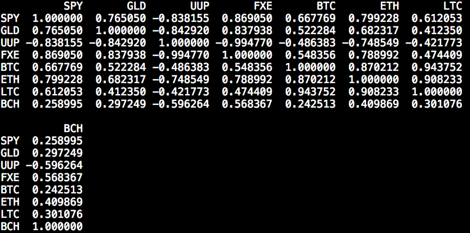 These basket of securities form a reasonable proxy for broad segments of the global financial market. Furthermore, movements in the price of these assets relative to one another can help us to understand what is useful for predicting a given asset’s price or price movement. For example, we see that UUP is negatively correlated with the price of BTC by roughly 50%. As such, the following would be a reasonable hypothesis to inspect further:
