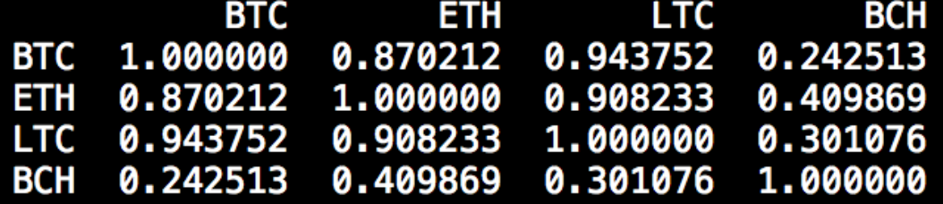 While it is not necessary to code, for those that can use Python or any other language that works well for data analysis, they can feel free to expand on the work presented here. Through this, and the coming set of articles, we will be utilizing Data Science methods to draw conclusions about how to understand what affects the price of a digital currency. Let’s first start by analyzing Bitcoin relative to a basket of other digital assets. We then will conclude by analyzing it relative to a broader market, which will include traditional financial instruments. The statistic we will use to analyze Bitcoin and other currencies in this article will be the correlation coefficient, which measures linear correlation between two sets of values. Simply stated, linear correlation determines the degree to which the movement of one series of observations positively or negatively is associated with the movement of another series of observations. Below is an example of some of the liner correlations we observe between different cryptocurrencies as they trade relative to USDT on a daily basis: