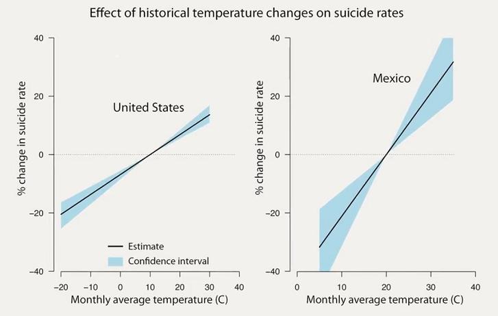 And what the second study did was to study the monthly suicide rates in Mexico and the US in recent decades, finding that suicide rates increase by up to 2.1 percent for each degree centigrade increase in average monthly temperature, remember that correlation does not always imply causality, but in this case the evidence is very strong.