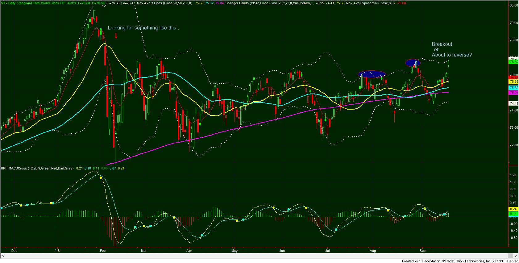 I believe that the market could turn lower from here. VT is probably setting up to be a pivot point. In the next couple weeks, we should witness a break back below the daily 8 period moving average. If not, then a new breakout is occurring and we could see new highs on VT. However, the likelihood of this is very low and the downside potential is YUGE to say the least.