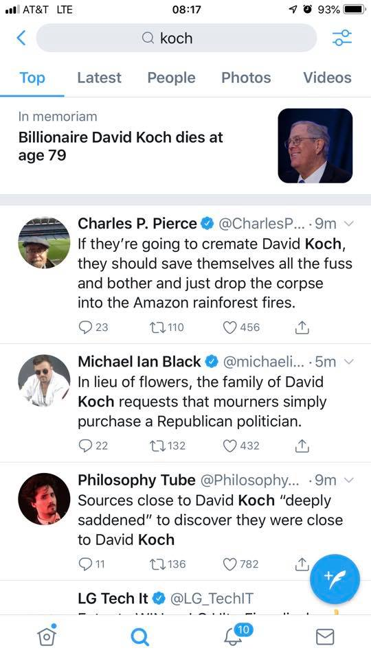 Today, on Twitter, 5,000 confirmed BlueCheckMarks applauded the death of David Koch solely because they disagree on his politics. They've never met him. They don't know him personally. They don't shy away from the fact that they applaud and wish the same death on others who have similar beliefs.
