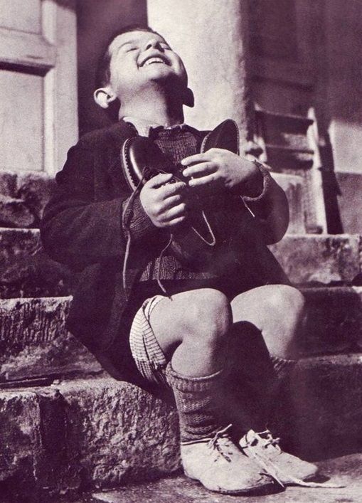 Boy receiving a new pair of shoes at an orphanage in Austria, 1946.
