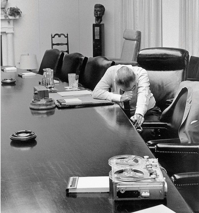 U.S. President Lyndon Johnson listens to a tape sent by Captain Charles Robb (his son-in-law) from Vietnam, 1968.