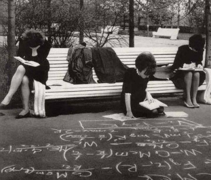 Female Soviet college students studying for their exams in a park in the late 1960s.