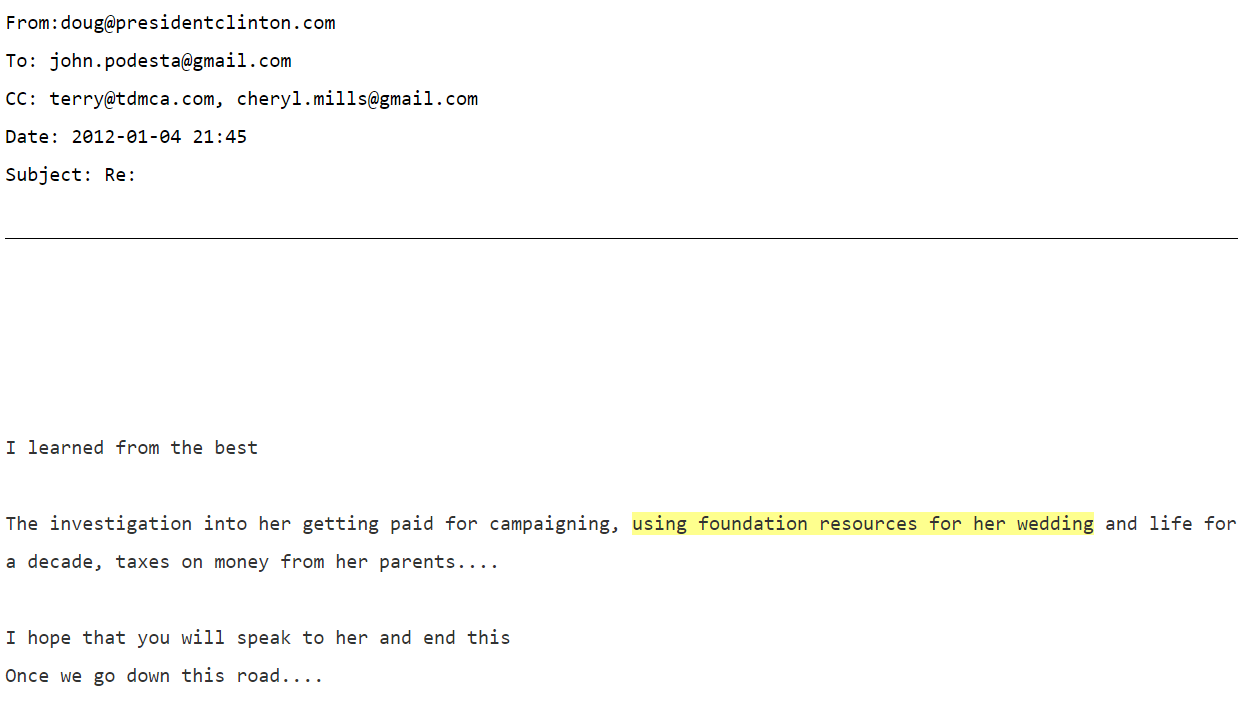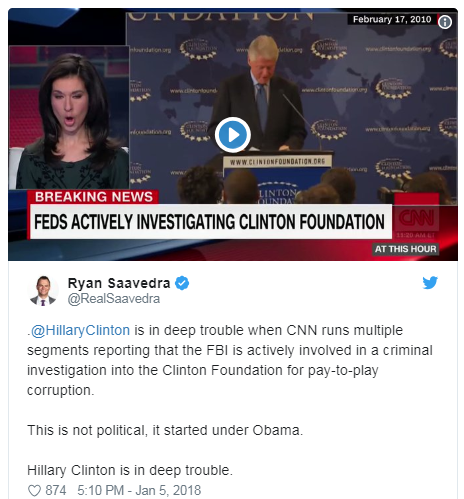 Clinton’s privilege and entitlement would not comfort her for long after her humiliating loss to Trump. With Congress having recommended a second special counsel to investigate the dangerous and subversive tactics Clinton employed leading into the 2016 election, the FBI’s work investigating the Clinton Foundation may well have begun long ago; Wikileaks’ disclosures concerning the Clinton Foundation and its potentially unlawful international dealings — particularly the questionable liaisons between the Clinton campaign and Clinton Foundation and foreign entities, including those from Russia and the Ukraine — have long been publicly available.
