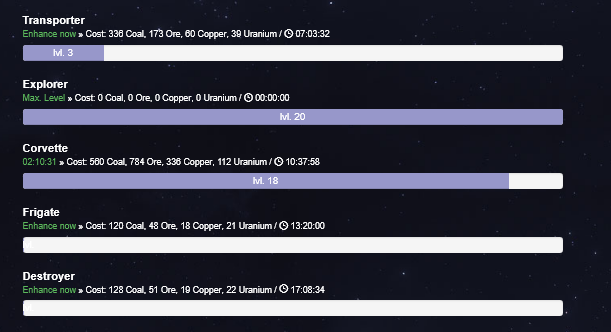 One week on and not that much progress. No additional planets found, they are proving to be elusive in this part of space. The skill level for Corvettes is now Level 18 and within a couple of hours will be Level 19. So one more level and possibly a Shipyard upgrade and I will have a new space toy to play with.
