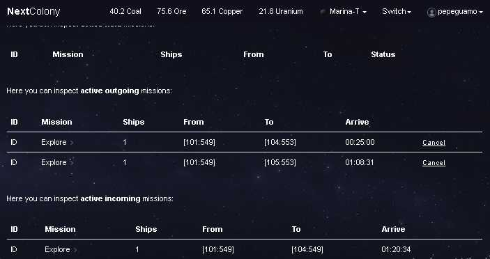 In the second image I present you the missions from the planet Marina-T, where I carry out 3 missions at this moment, two are on their way and one returns home, hopefully achieving a planet in this opportunity, to continue growing the amount of resources they contribute to develop them. By the way, when you get a planet, the first day you must be attentive to go up the mines as soon as you have enough resources, so that you get the levels to 5 as soon as possible, if you wait to climb evenly you are very late, do not do so, if not as I say in principle, attentive to every hour of update of the mines in principle.