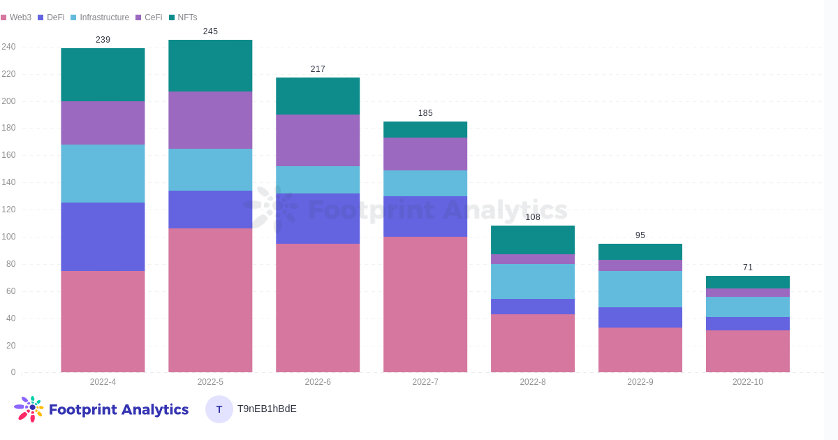 - It becomes increasingly difficult to separate NFT projects from others and analyze the category in a clean vacuum, as Web3, GameFi and infrastructure increasingly converge with NFTs. For example, the top project by funding, Stardust, can be classified as both an NFT and a gaming project.