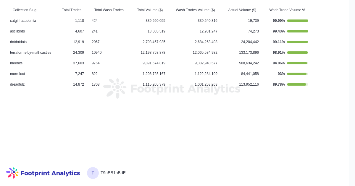 - Meebits, Terraforms by Mathcastles, and Dreadfulz were the three most highly traded collections by volume in October. Their suspected wash trading amounts were 94%, 98% and 89%, respectively. Note: These are percentages of total trade volume, not total trades.