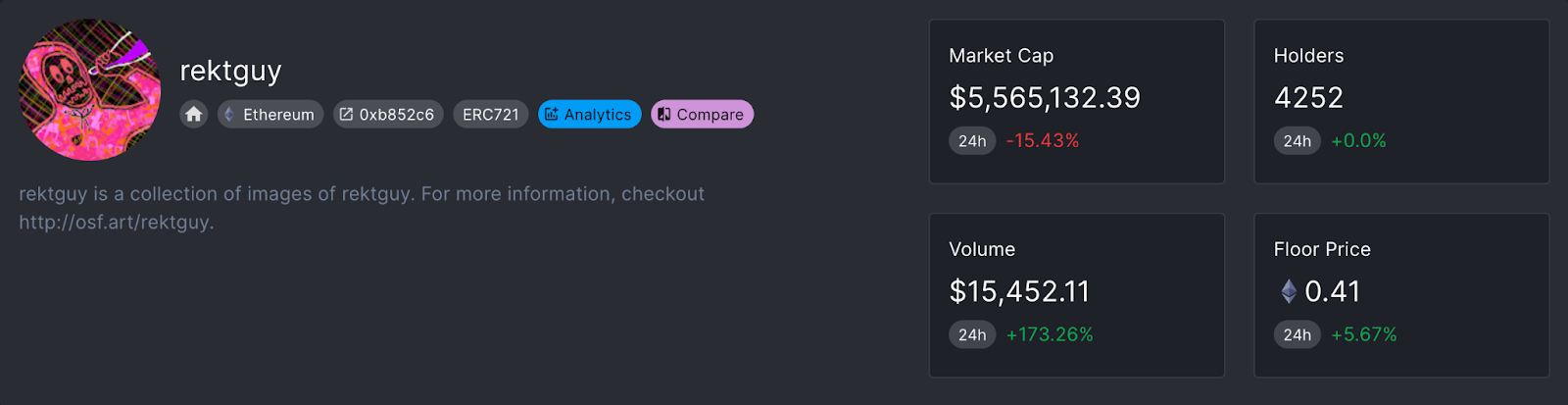 The floor price for the rektguy collection is currently 0.42 ETH. The cheapest token is rektguy #5010, with a rarity rank of 8033. The highest last sale was rektguy #6113, with a rarity rank of 7, and was traded for 20 ETH on May 29th.