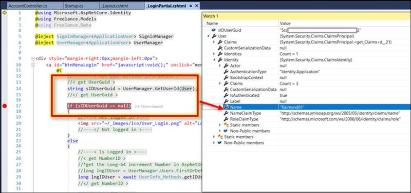 Normalerweise wird beim Aufruf einer Seite der aktuelle User in der Views/Shared/_loginPartial.cshtml abgefragt und erkannt