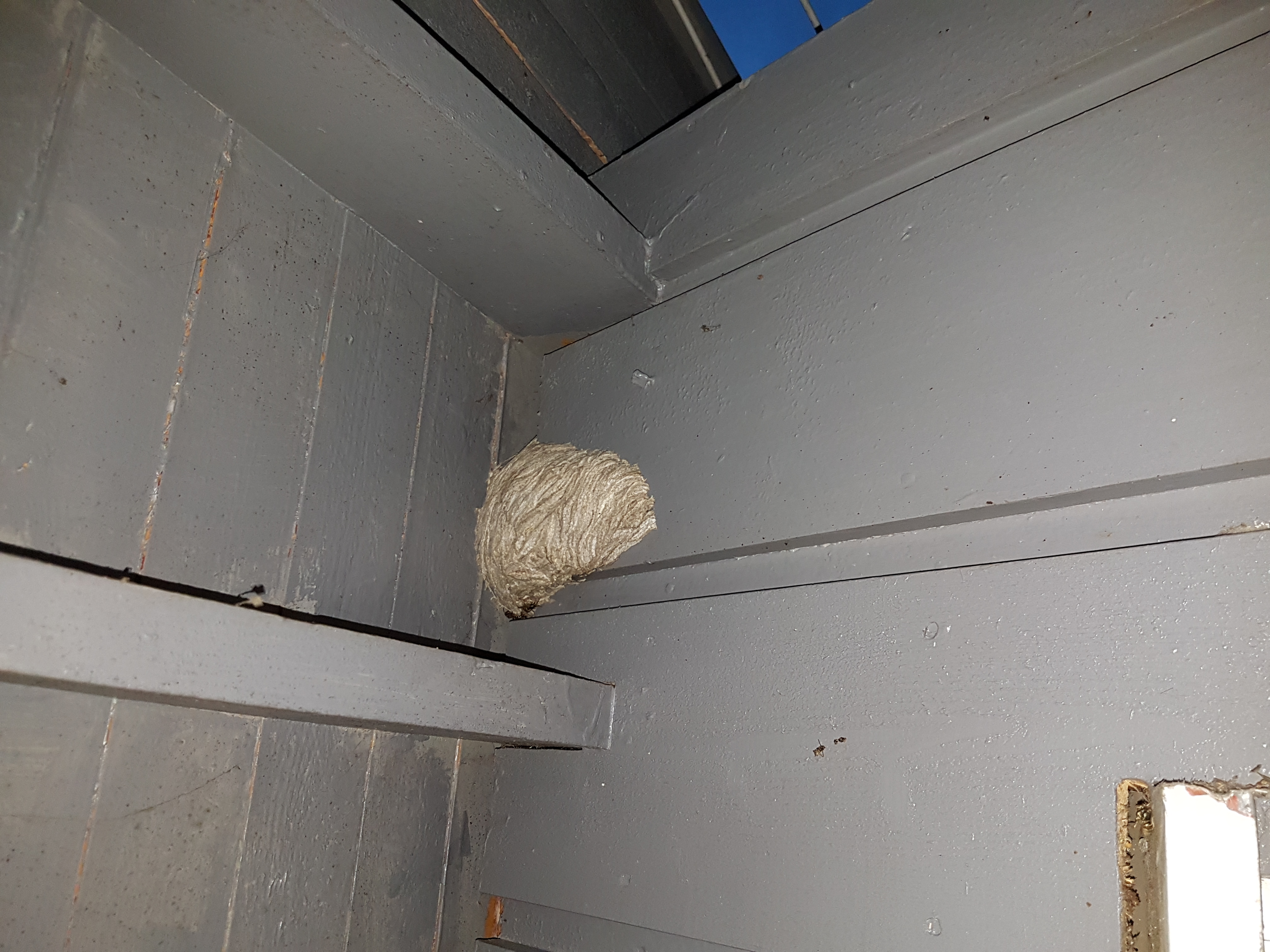 Da var det gjort! Vepsebola er spraya fulle av Super Permetrin. Vepsene kom sjanglende ut, og datt ned på terrassen!