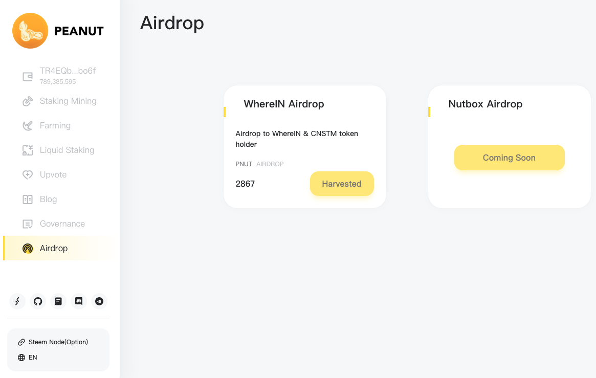 In the begining, we need the Tron-id for the supporters in order to send the airdrop of PNUT. Last week, we did the first batch of airdrop, but only got 70 eligible users; and there are still 220 eligible users did not register their Tron-id. In order to make the airdrop more smooth for the eligible supports, we developed a new airdrop interface. Please refer the instructions below.