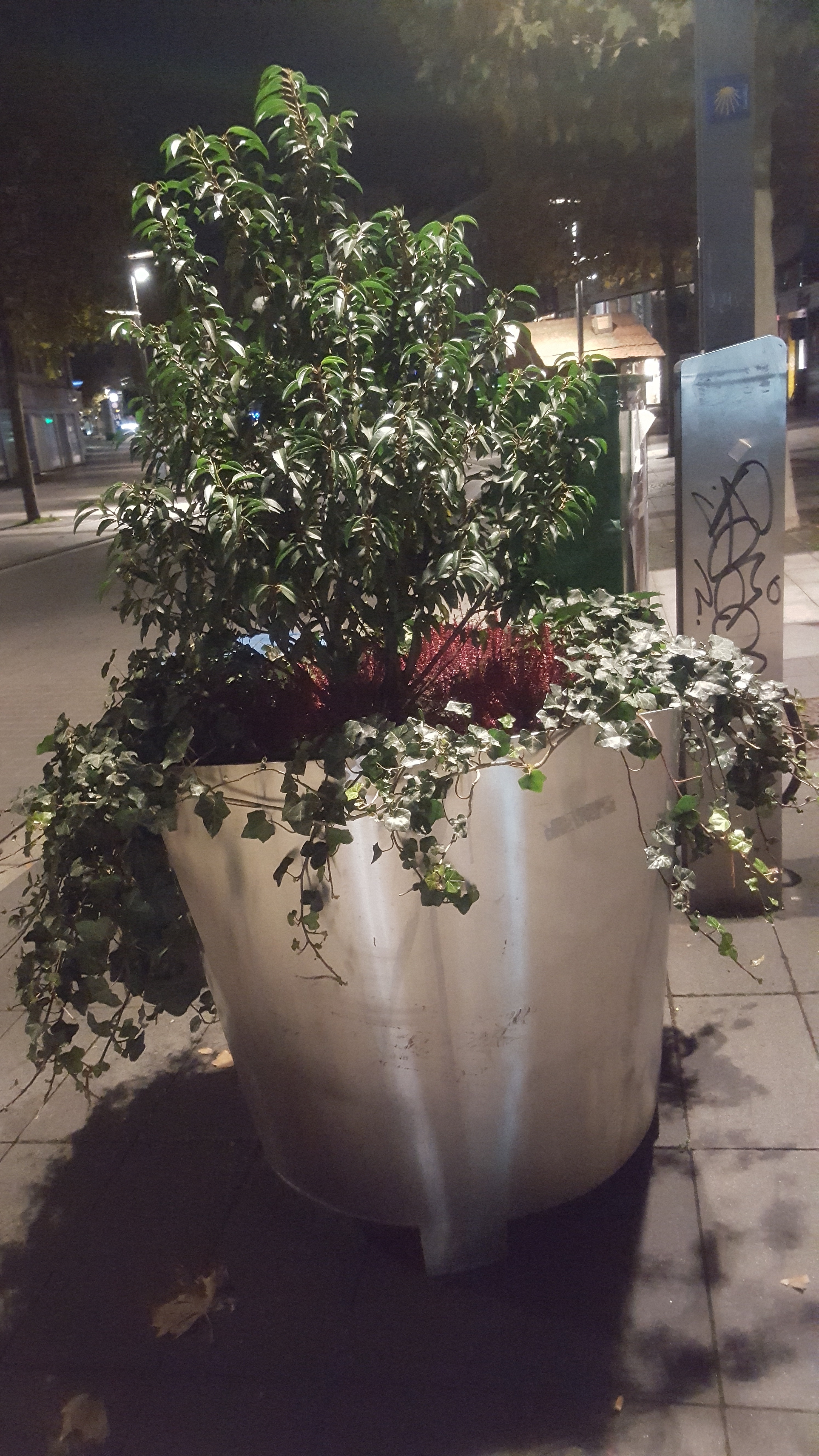 -Gestern Abend beim Nachhauseweg in der Innenstadt. Es reicht ein Grosser Topf aus Silber, Strassenlicht und direkt fühle ich mich wohler bei dieser Strasse weil es nicht nur aus Grau Tönen besteht.-
