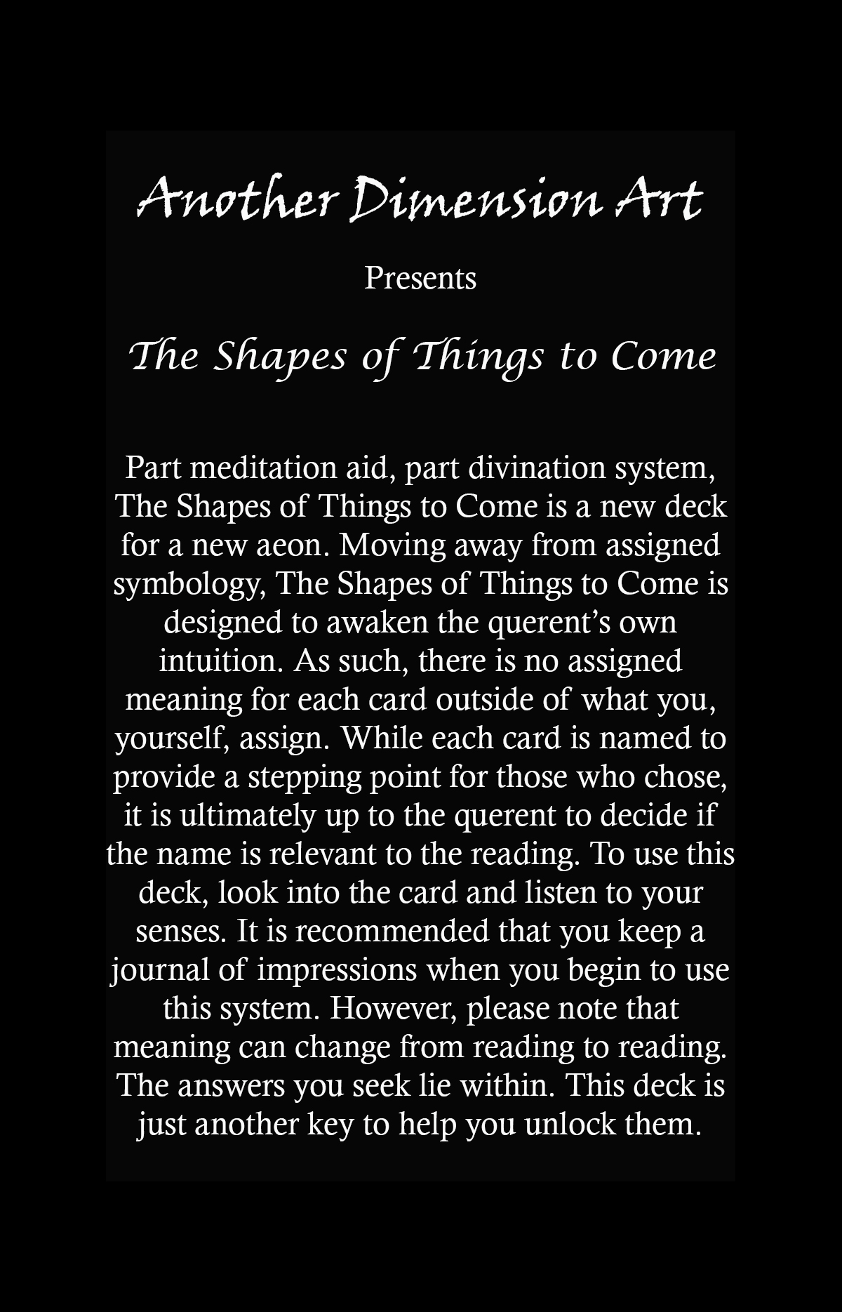3.5 years after its inception, The Shapes of Things to Come is ready to enter beta testing. The first deck will be in my hands in approx. two weeks, at which point, if I'm satisfied with the quality, the link will go out to my beta testers.