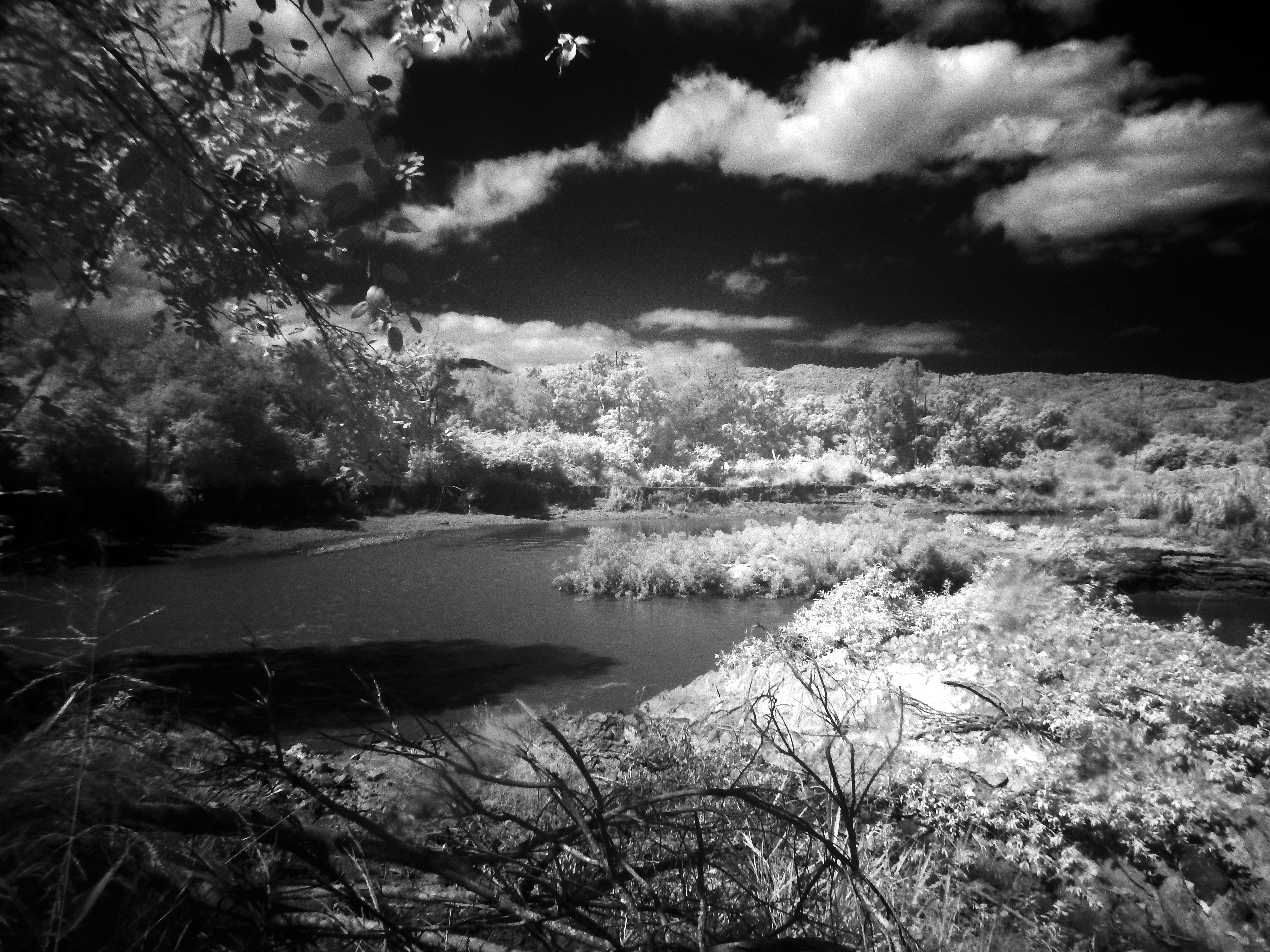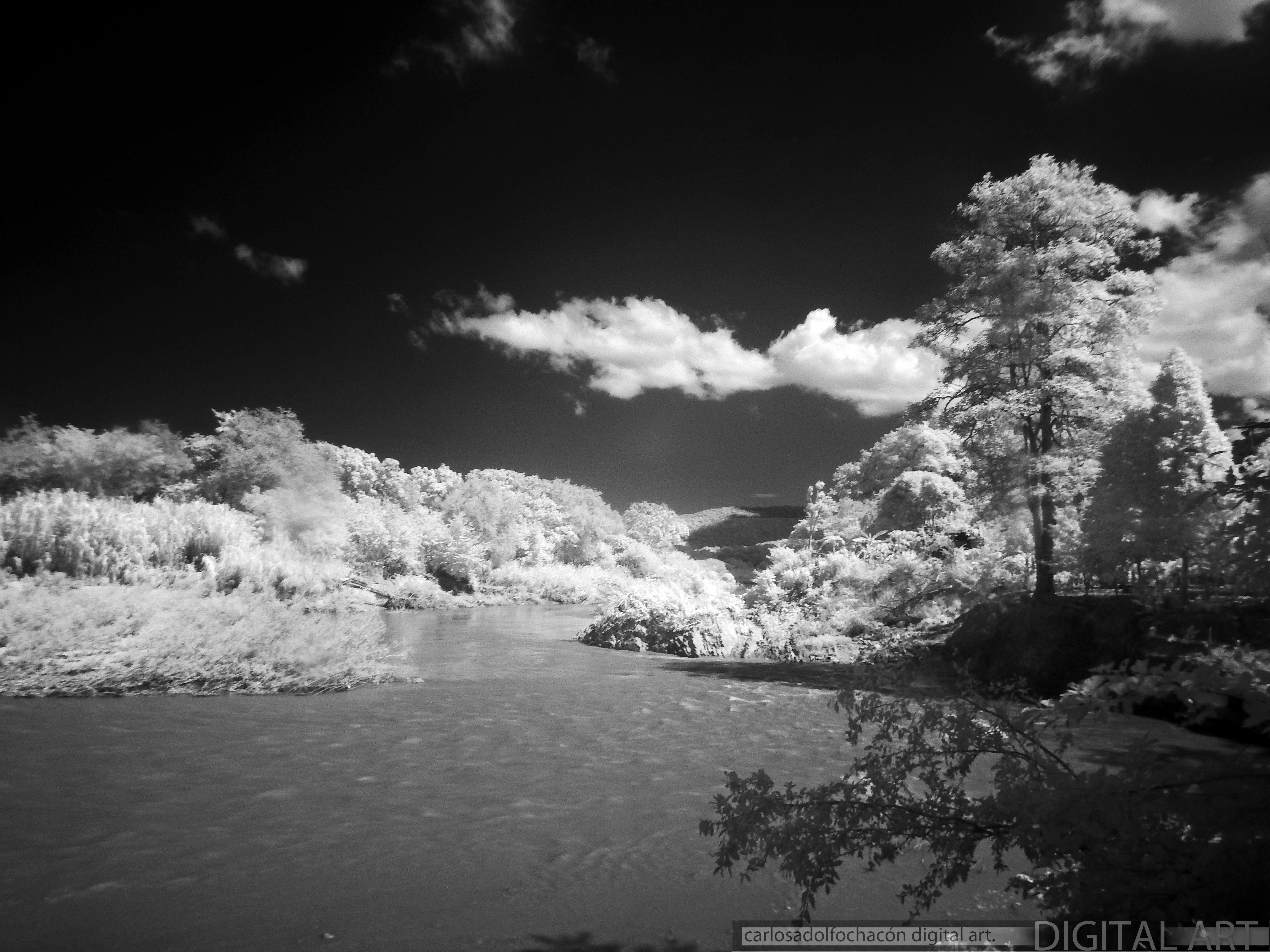 Mi pana saludo... te cuento, La fotografía Infrarroja capta el espectro invisible de la luz por eso la vegetación se ve blanca ya que reflejan la luz invisible y el cielo cuando está azul se ve oscuro en blanco y negro... se pueden hacer en colores y es fascinante aunque con mayor grado de dificultad es difícil hacer infrarrojas por eso me gusta tanto jajaja es un reto maravilloso!