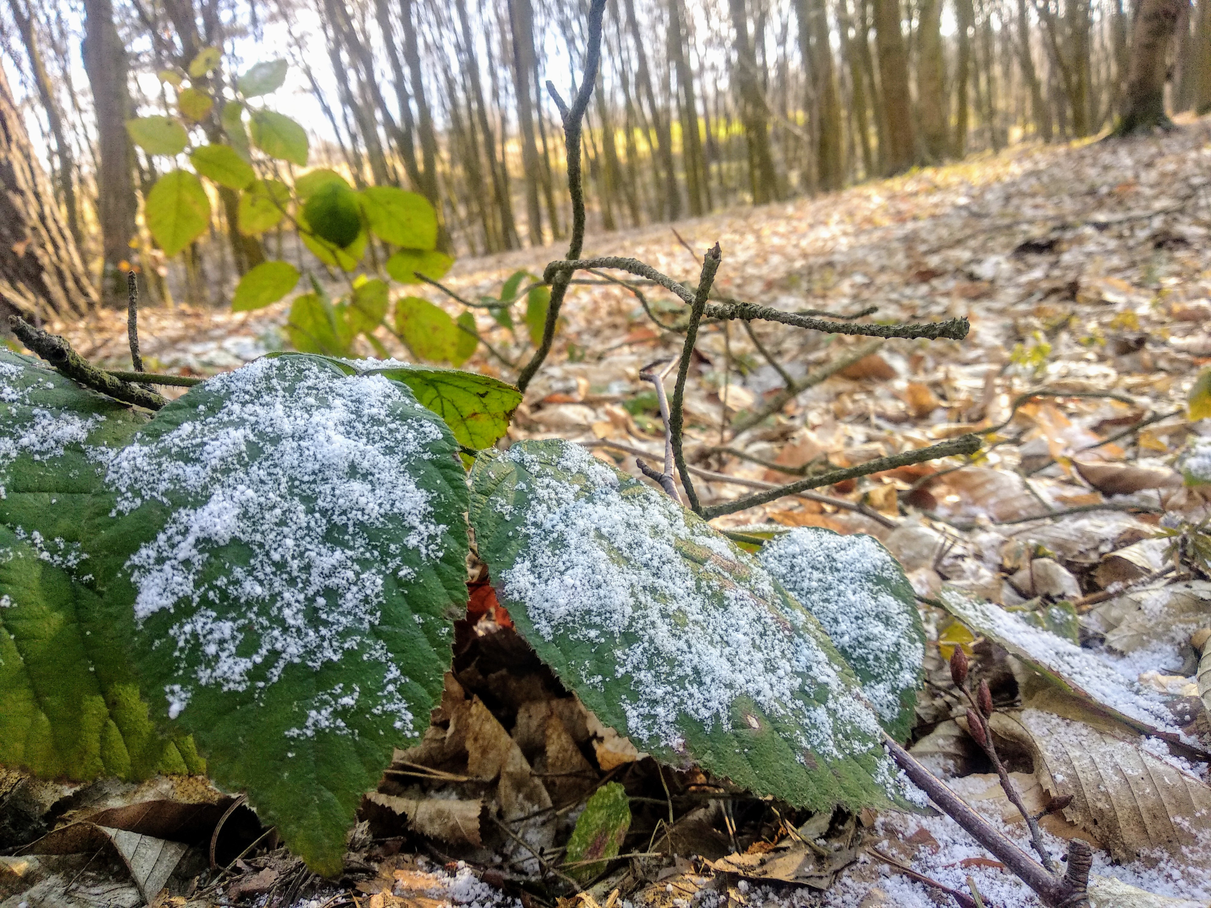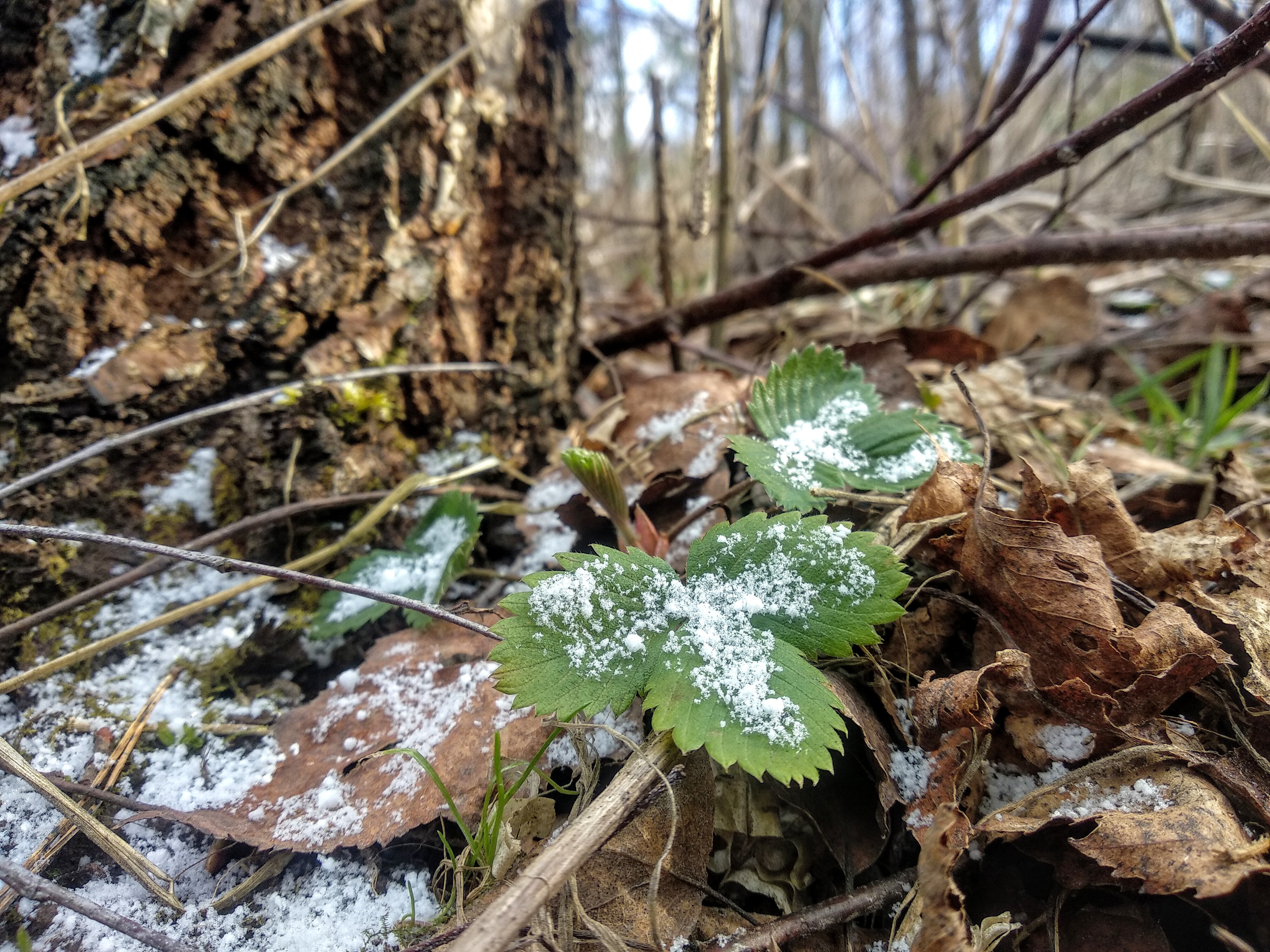 Yesterday I could sit on a warm last year's leaves, and today you see how much snow on a blackberry leaf!