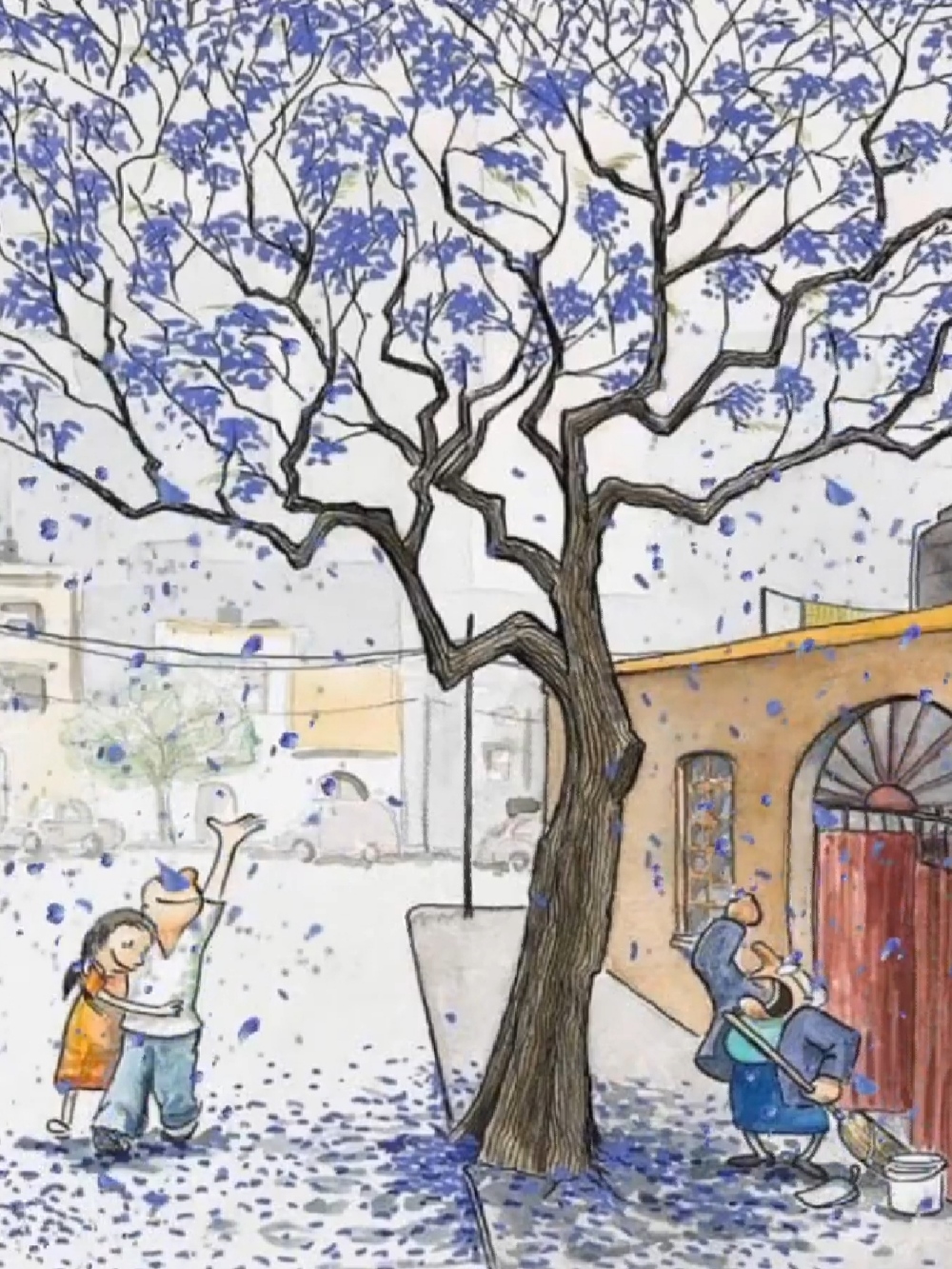 The tree shedding flowers and beneath are people expressing their intake of the situation- The left couple being happy and joyous enjoying the flower rain and spreading positivity and the left old lady was irritated and disturbed through the falling flowers and spreading negative vibes but if we see thoroughly I feel like because there's reason for the lady as she needs to clean the floor up.