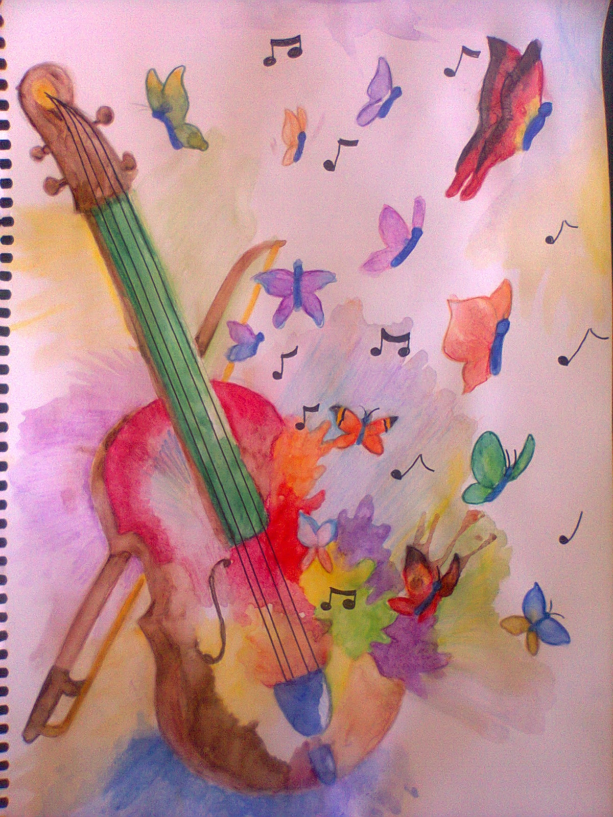 Next, with the help of a wet brush I went over the colors, which gave my drawing the finish of the watercolors, beginning first with the violin