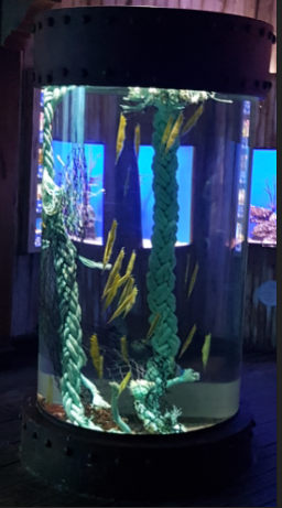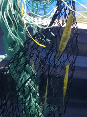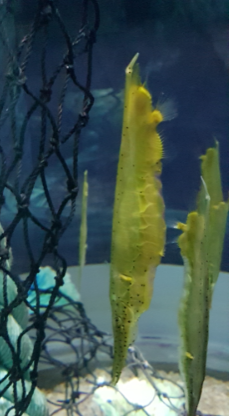 These fish float in a head-down position, they have no scales but have a series of bony plates and a fan-like tail fin. The Ghost Pipefish varies in colour (brown, green, pink and yellow) and body shape which serves as camouflage (helps them to blend in with their environment in seaweed or vegetation). Their bodies are elongated and have white and black spots on it, they have a long head with a tubular snout (to suck up their prey) and their dorsal fins have two dark spots on it. They can reach a length of up to 20cm.