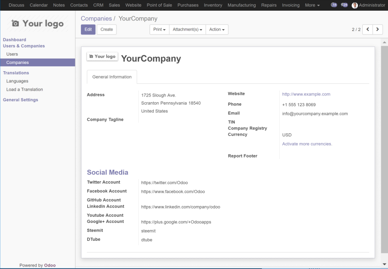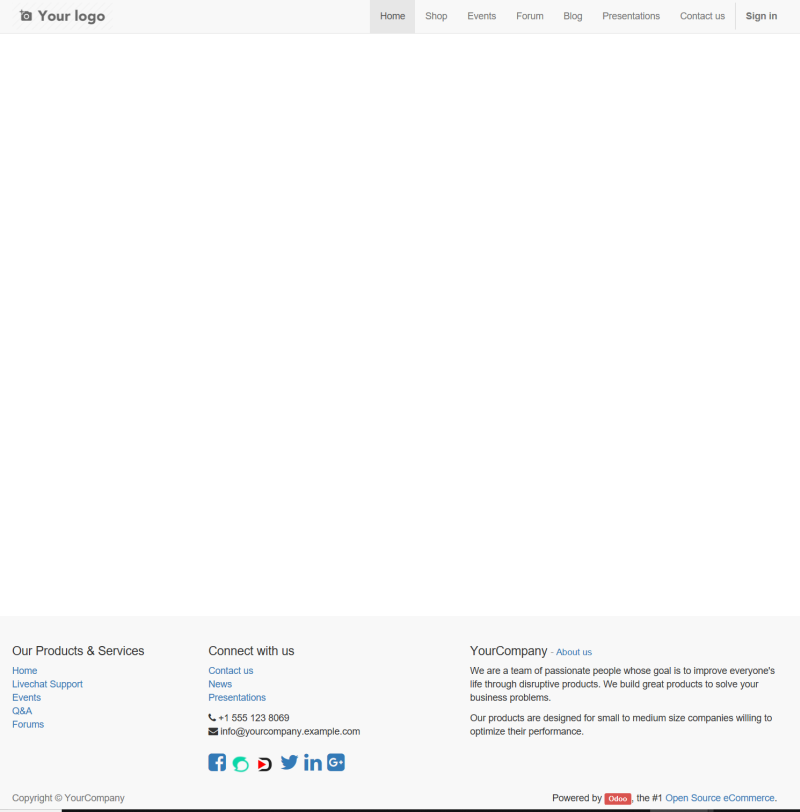 Naturally social media links will be displayed only if you want it, thanks to the social media page in Odoo