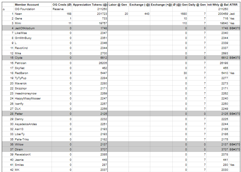 In Block #333, ending 2/26/2024, a total of 2175@ (Appreciation Tokens) were generated; 322@ were generated by the daily appreciation of 46 members, 20@ were generated as the result of 2 hrs of labor exhausted on behalf of Allodium, and 1840@ were generated by 184 OG Creds (Ø); bringing the total to 596,020@.