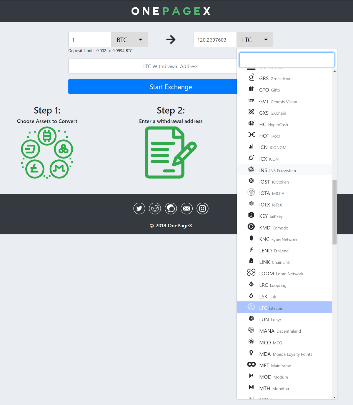 “OnePageX has only just been launched. There are numerous upcoming implementations that will allow users to convert more cryptocurrencies. While in this initial launch all the cryptocurrencies are converted from Bitcoin, other assets are actively being added. Plans for the future include an implementation for STEEM as well. The OnePageX vision is to enable trading most cryptocurrencies with a simple interface”.