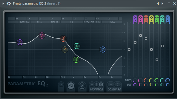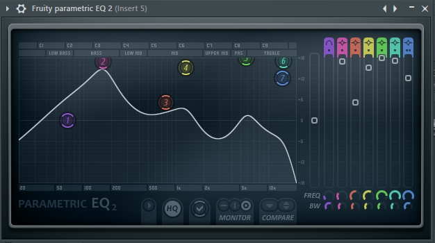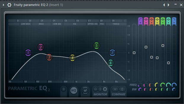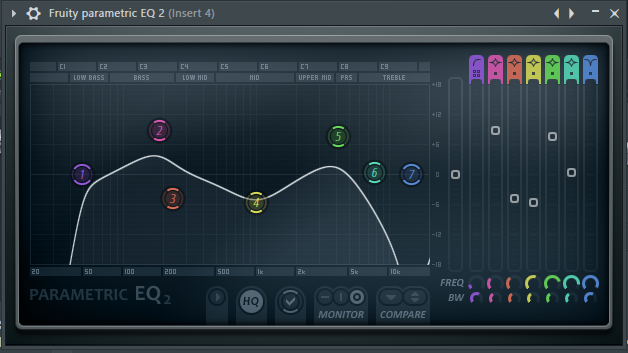 For the equalization I used the Fruity Parametric EQ 2 plugin, for the reverb I used the Fruity Reverb 2 plugin and to limit the spectra I used the Fruity Limiterplugin