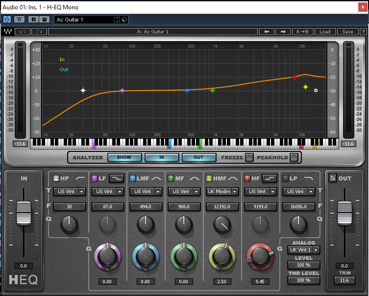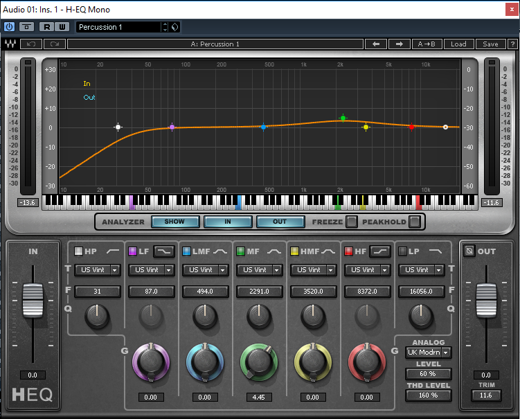 For the equalization of the stringed instruments (all except percussion) I used the HQ-EQ Mono plug-in from the WAVES with the AC Guitar 1 pre-set that helps to get it out pretty shine to the strings sound.