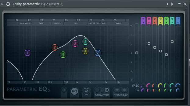 Para la ecualización utilicé el plugin Fruity Parametric EQ 2, para el reverb utilicé el plugin Fruity Reverb 2 y para limitar los espectros utilicé el plugin Fruity Limiter.