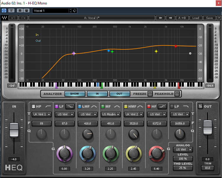 Para la ecualización de la voz principal utilicé el mismo ecualizador de los instrumentos pero con el pre-set llamado Vocal 1 que está especializado para la voz y le saca un buen brillo a los agudos y le da un buen equilibrio a los medios.