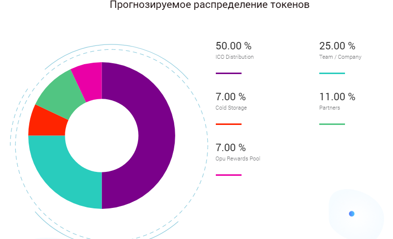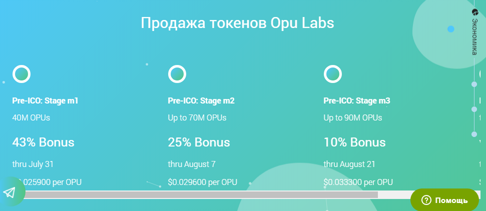 Распродажа токенов проходит в 4 этапа. На первом этапе, который длился до 31 июля, стоимость токена составляла $0.025900 per OPU, бонус составлял 43%. На момент написания статьи проходит второй эатп предварительной распродажи, который продлится до 7 августа. На нем бонус составляет 25%, стоимость токена $0.029600 per OPU. Следующий этап продлится до 21 августа, бонус будет составлять 11%, а стоимость токена $0.033300 per OPU. Последний этап распродажи будет длиться до 30 сентября 2018 года либо до момента достижения Hard Cap. Дополнительного бонуса уже не будет, а стоимость токена будет составлять $0.037000 per OPU.
