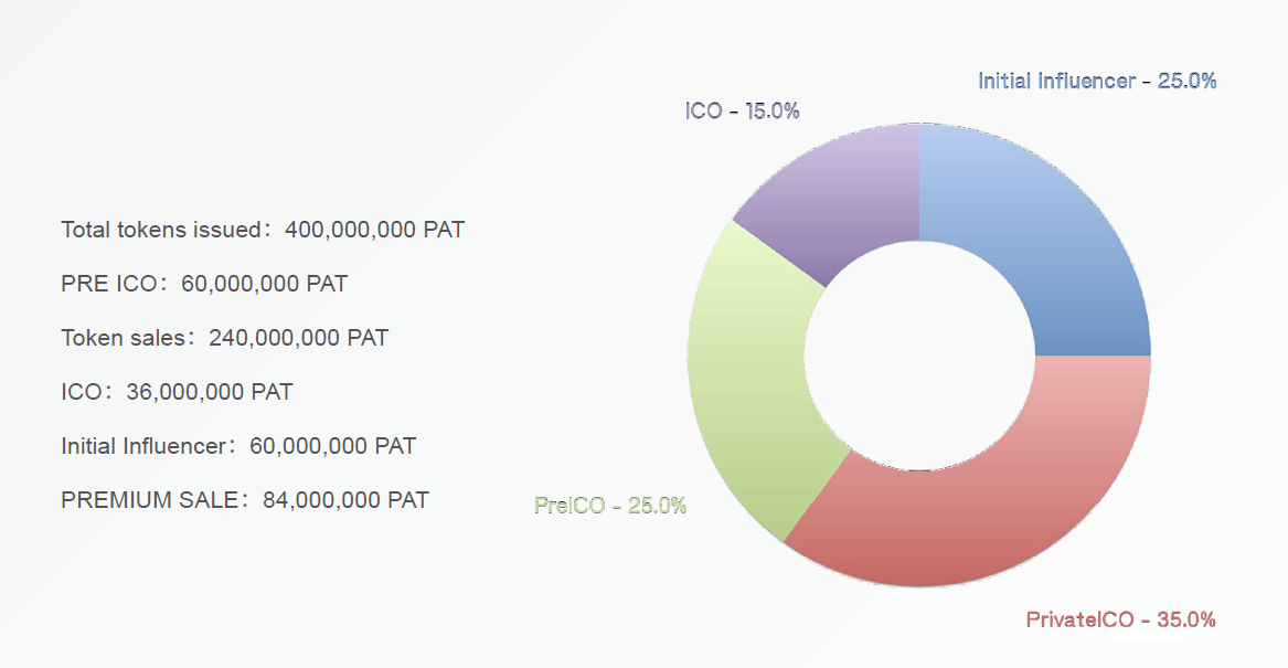 PATRON issued a cryptocurrency called PAT which is based on the Ethereum block chain and is an ERC20 token, which will have a 240 million token distribution and a total offer of 400 million in the ICO, this token will be used to several services within the platform because the token holders could communicate with Influencers through the platform using the PAT token and also the token holders could "like" the influencer of their liking and in this way help them increase their popularity .