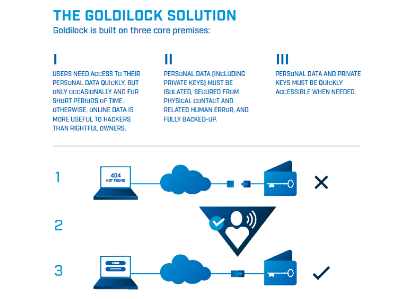 It is a system of custody of cryptocurrency keys and storage of digital assets. It offers adequate storage for our wallets. Goldilock's core is to offer a patent-pending air gap response, which is controlled by the user and activated remotely in order to create the necessary security of the keys used and confidentially safeguard the data of our assets. digital