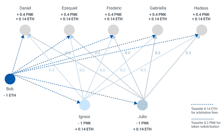 Kleros allows people to safeguard their contracts by using smart contracts with stated conditions that MUST be met before payment can be made. This ensures honest work and prompt payment, and in the event that one party defaults or fails to hold up his end of the bargain, the Kleros contract is triggered and professionals in the field of interest are called upon to mediate in the matter. The details of the smart contract are encrypted and kept secret off the blockchain. The disputers deposit Pinakoin(PNK) and pay jurors.