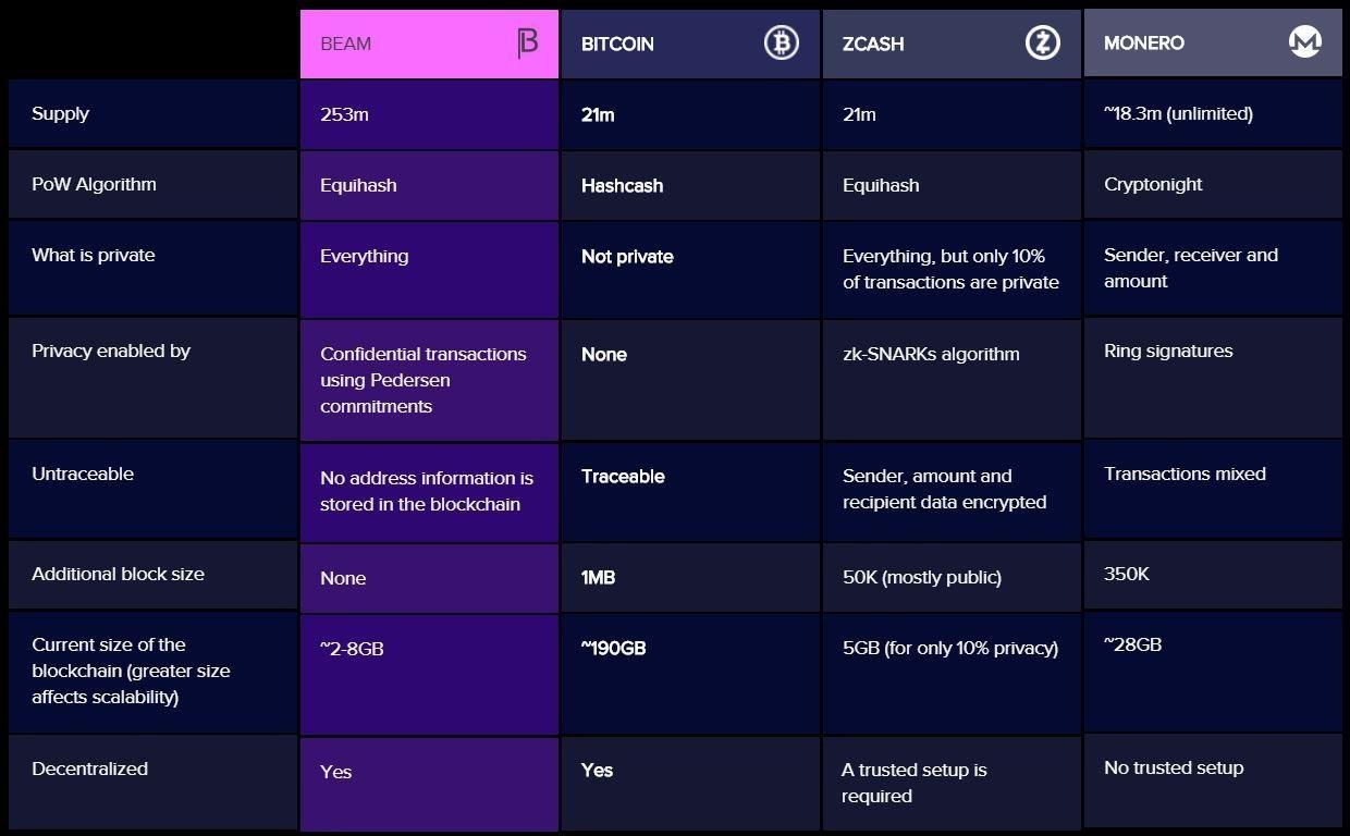 Beam gives it's users 100% charge or control over their privacy, thereby eradicating third parties. Also beam supports various transaction types such as escrow transaction and more...