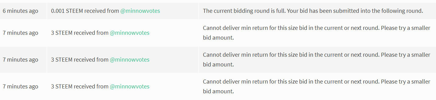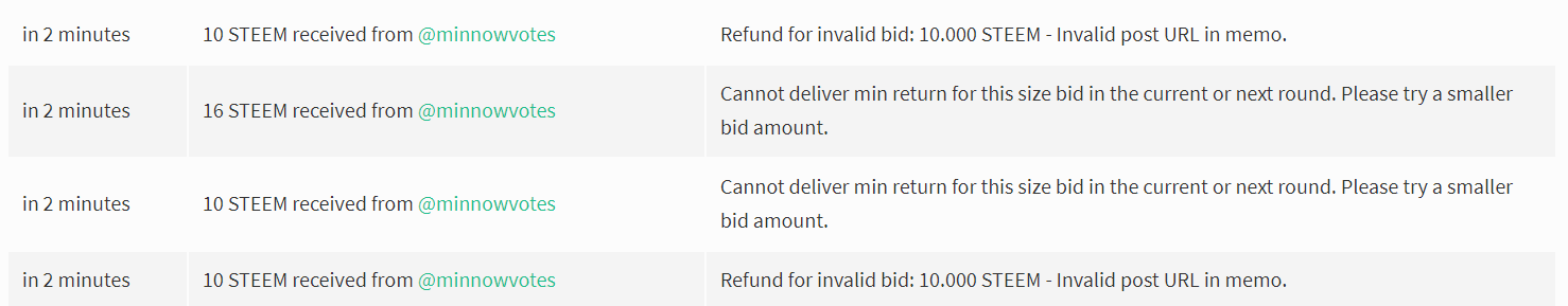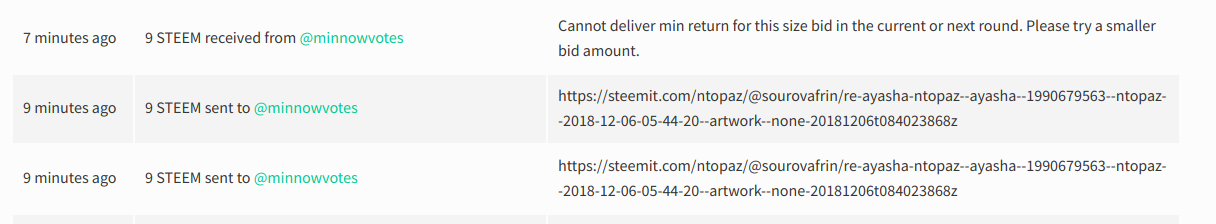Hey @minnowvotes. I sent 9 steem twice. But bot returned only once. Neither it didn't listed me on next round for that amount neither it returned. Can you please check.