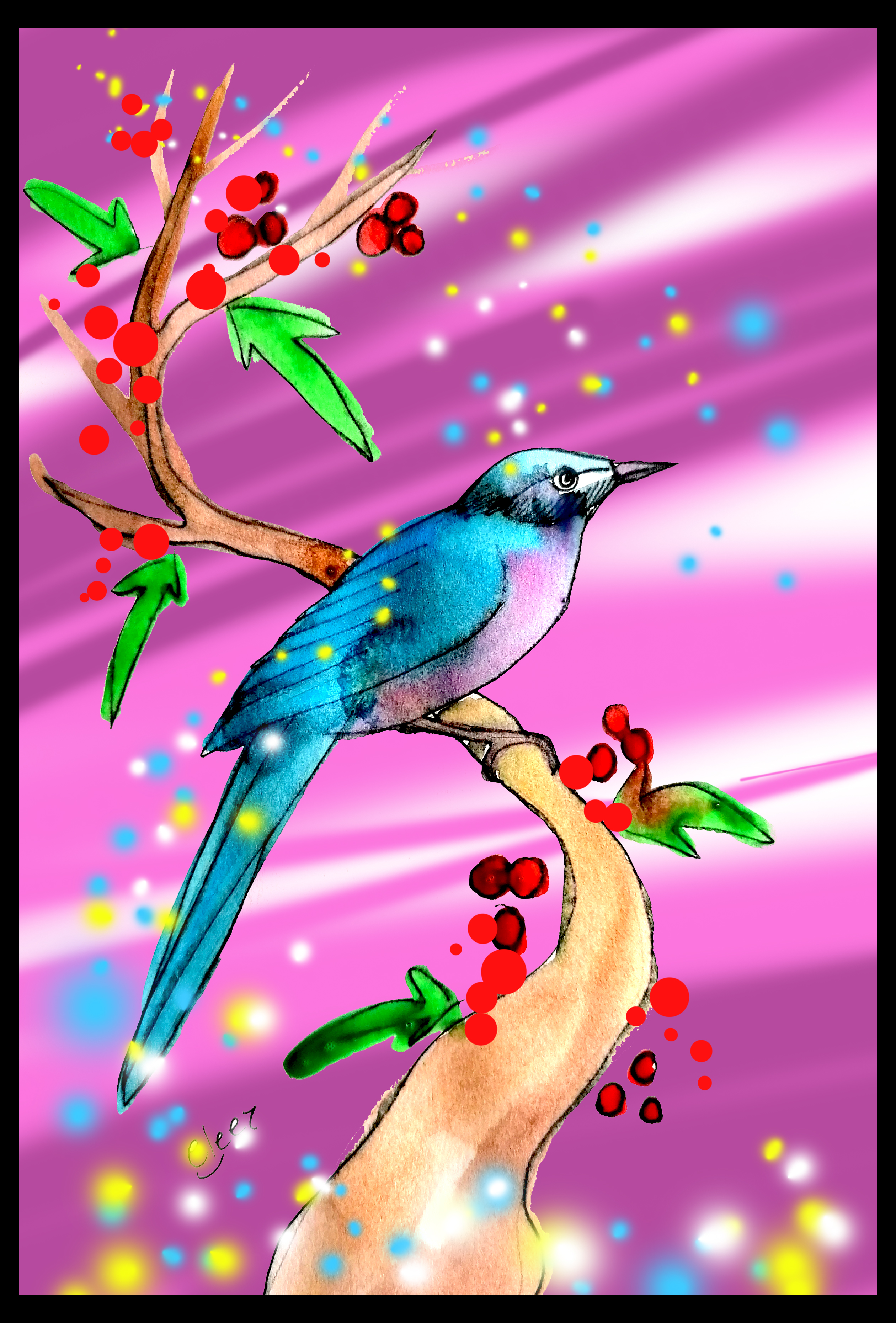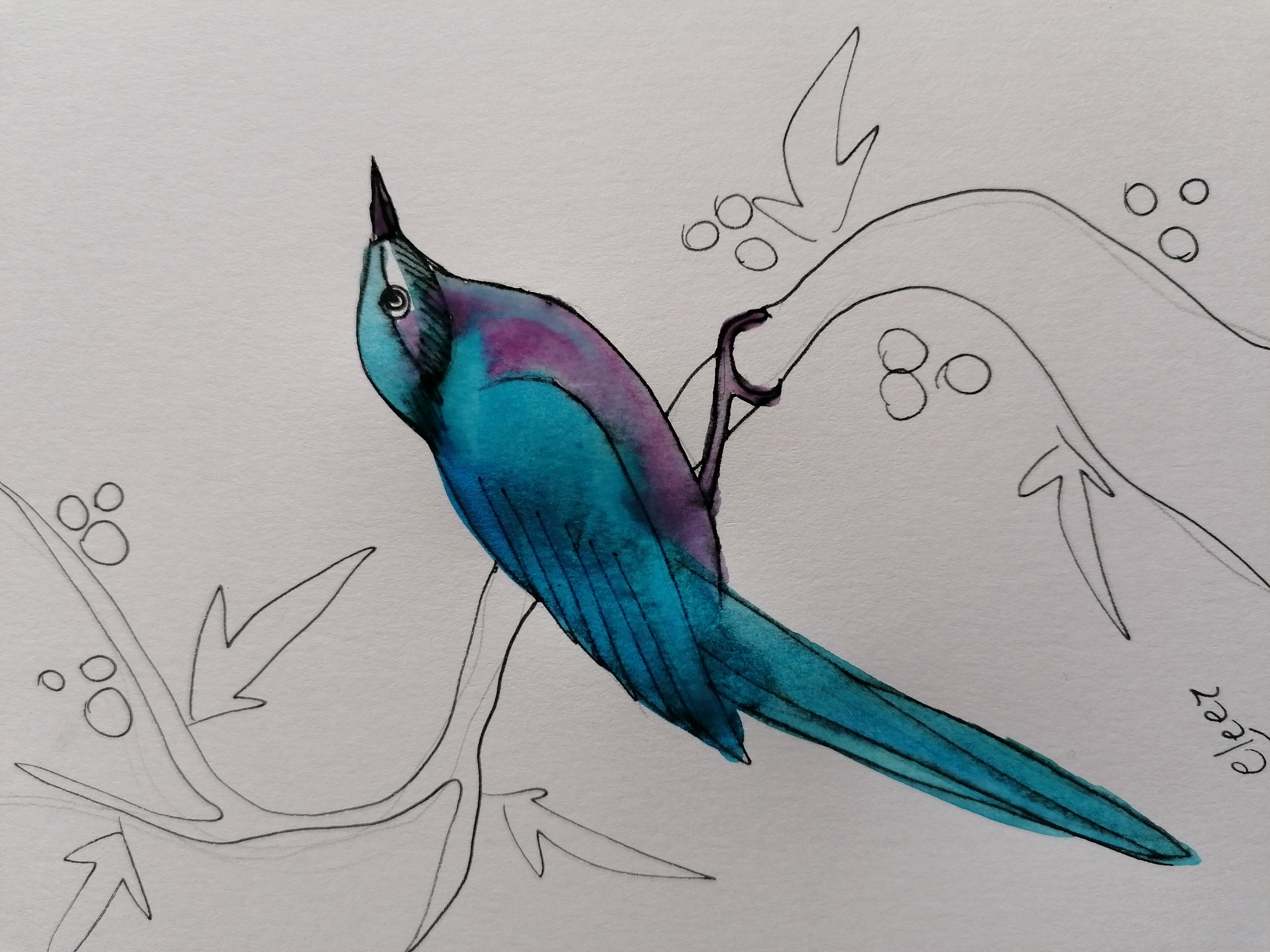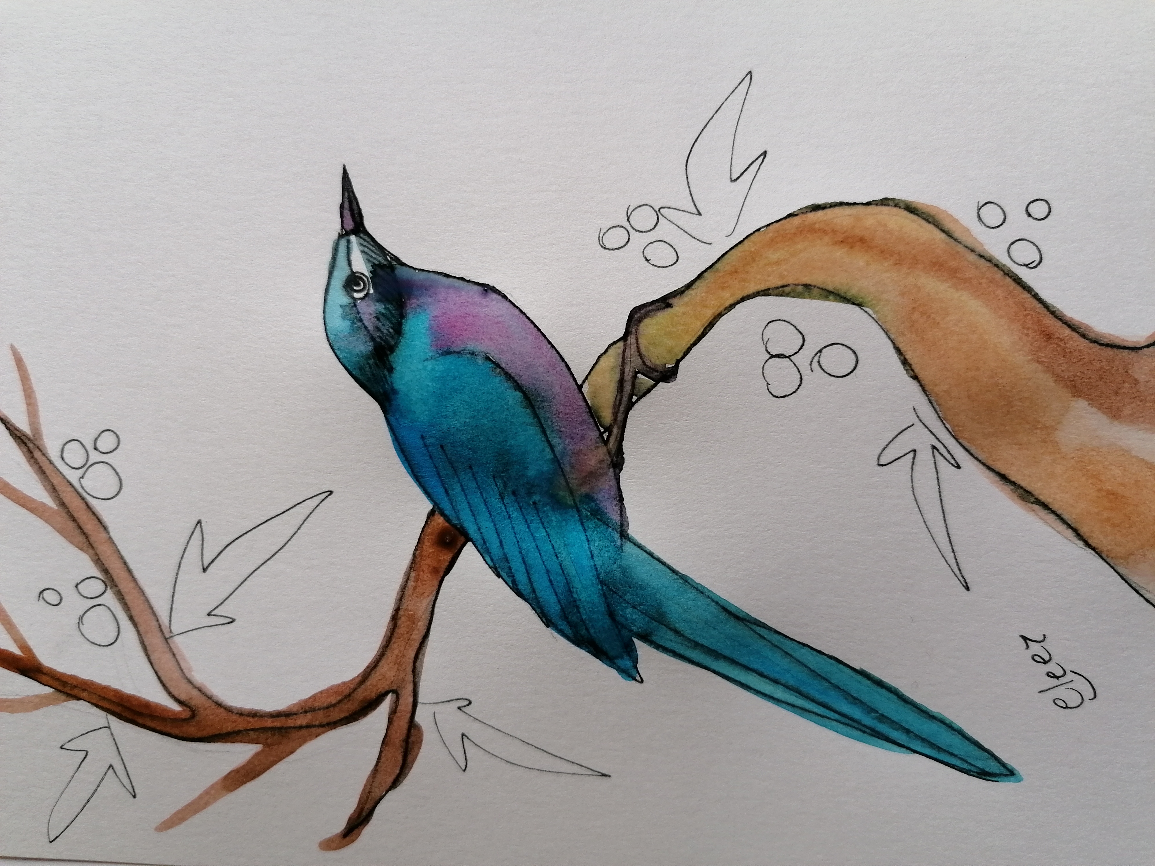 i have a new painting , beautiful blue bird , he looks so happy in a sunny and beautiful day . i draw it on gray paper and colored with watercolors , and use a painting program to put vibrant colors on it . now you can see how i paint it with watercolors step by step