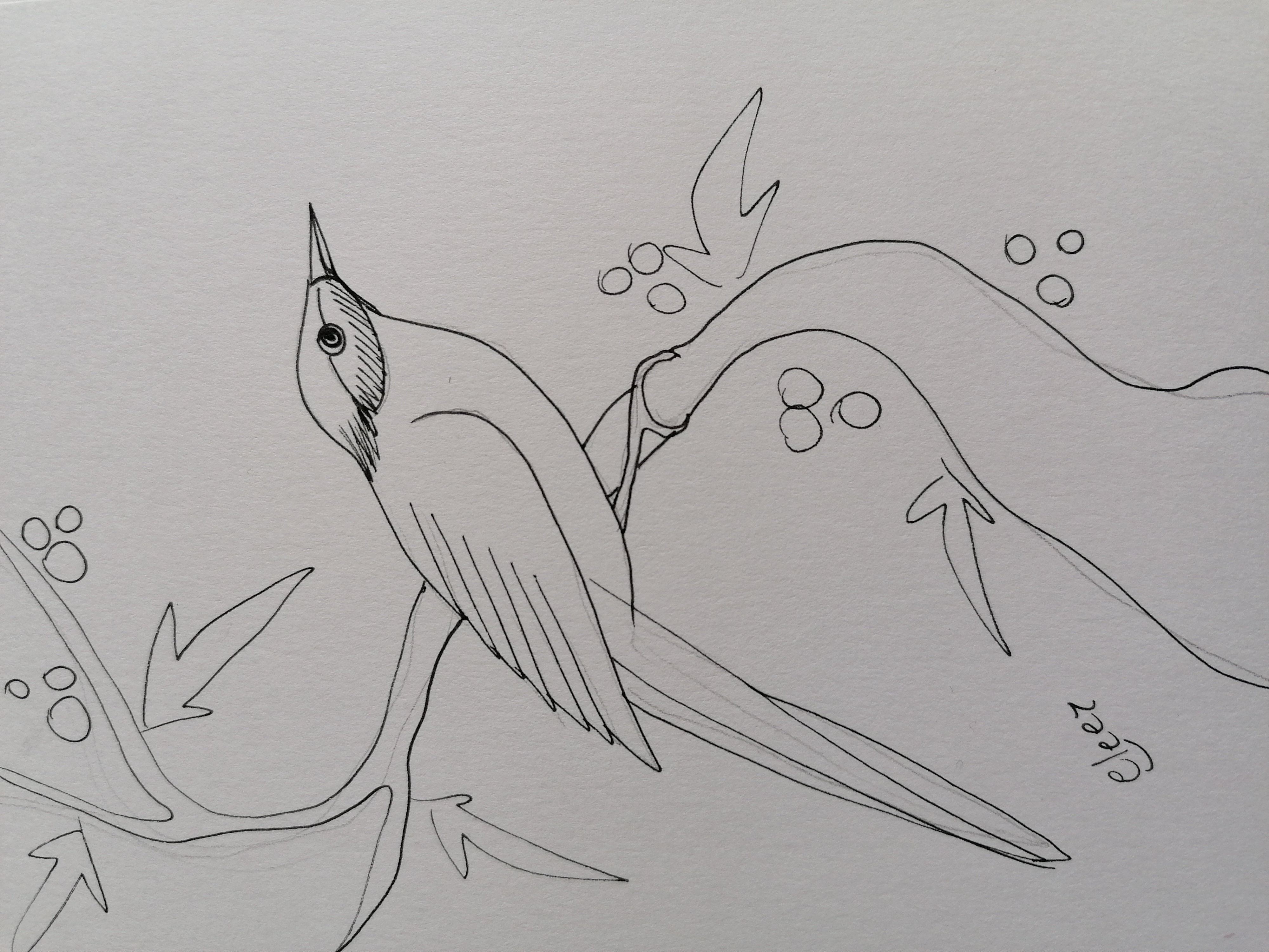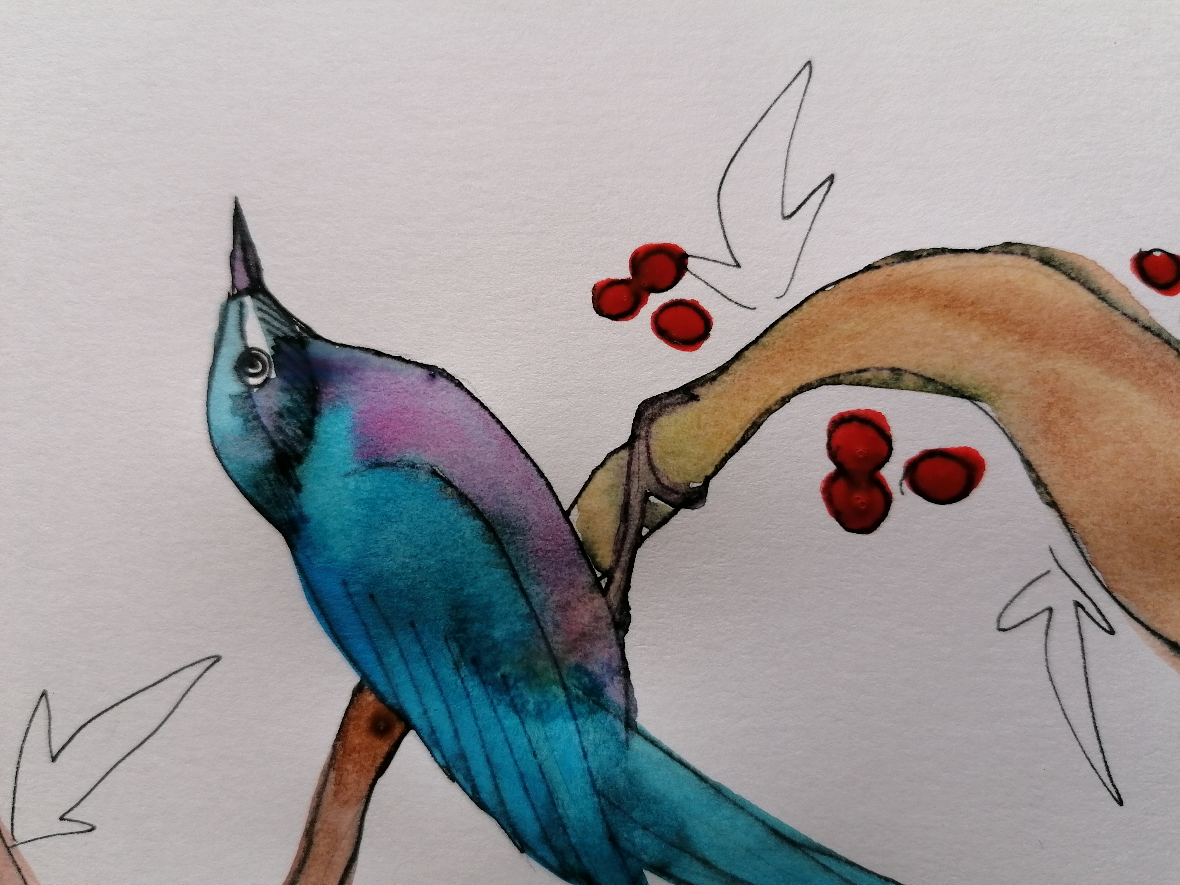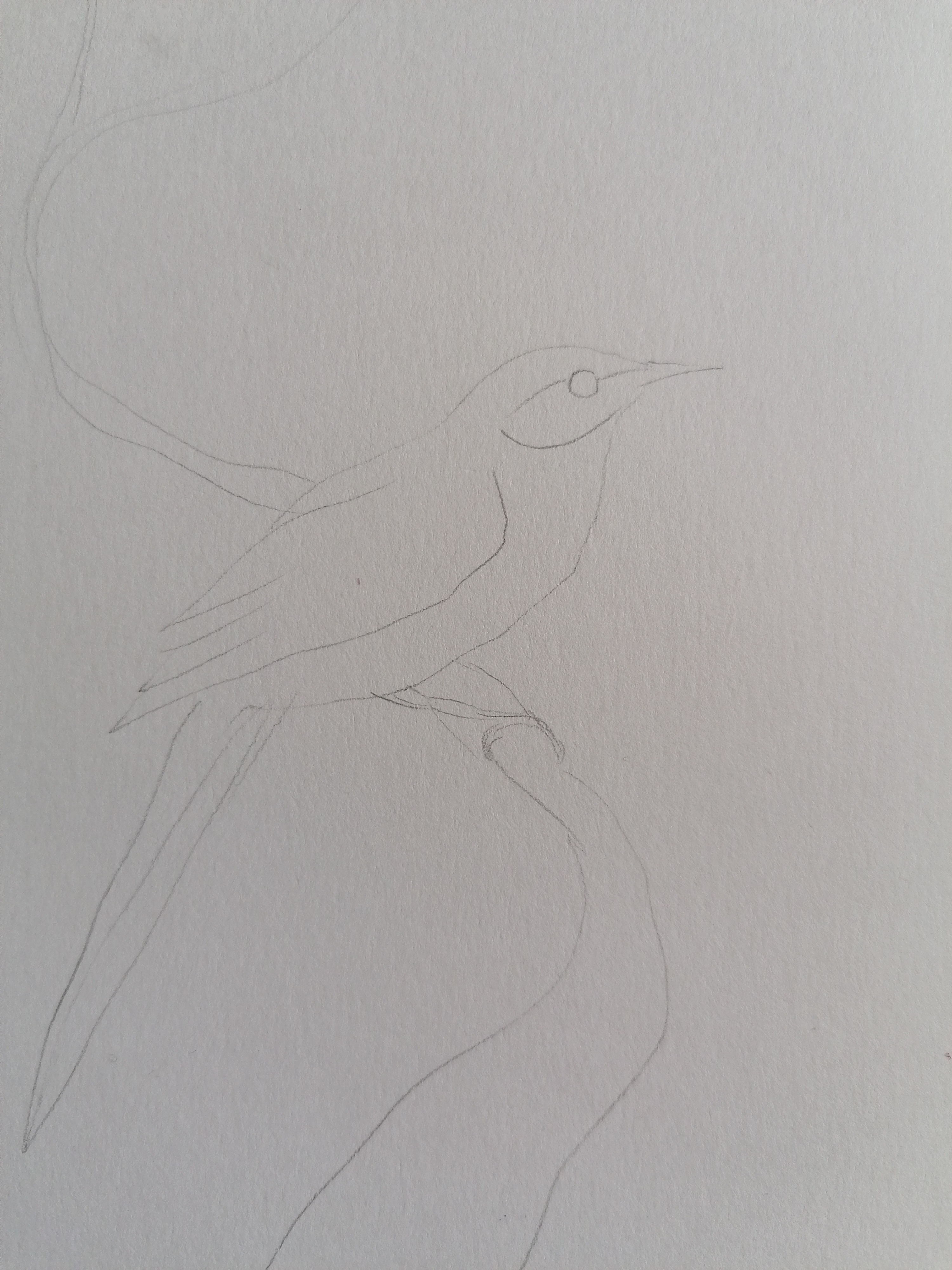 i have a new painting , beautiful blue bird , he looks so happy in a sunny and beautiful day . i draw it on gray paper and colored with watercolors , and use a painting program to put vibrant colors on it . now you can see how i paint it with watercolors step by step