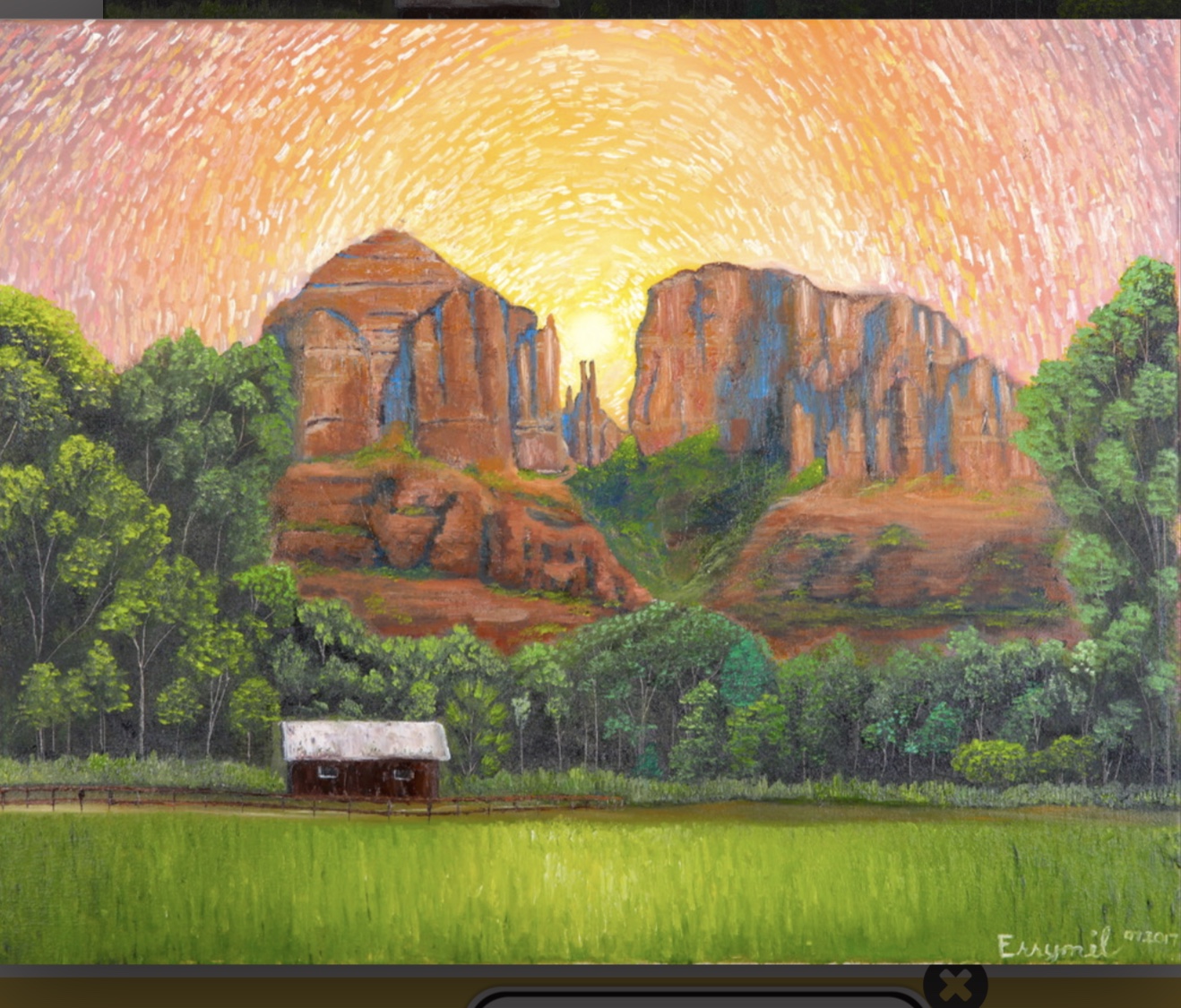 Photo and painting by Errymil, I fell in love with Sedona on the first time we went there back in 2014, this was our first stop and I was just amazed at the beautiful art that God has created. Still one of my favorite places to go for solitude and peace. I used oil paint with a impressionistic style inspired by Van Gogh, I like thats style because it of the energetic flow that it can create.