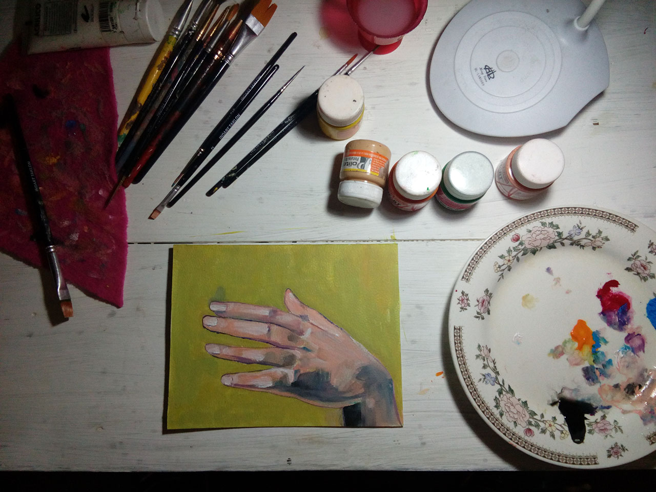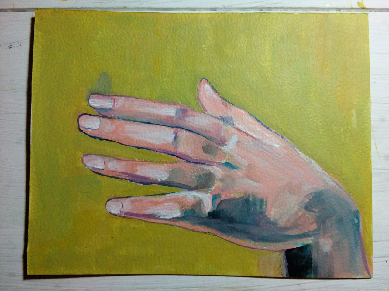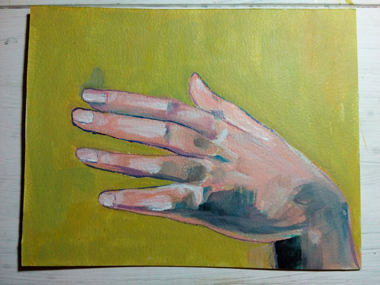 Hace un par de días tuve un momento de inspiración después de las 10 de la noche, y quise hacer un pequeño dibujo, sencillo, pero quise intentar hacer una mano que pareciera realista. Parece fácil pero la técnica de acrílico sobre papel no se debe subestimar nunca 😊. Es complicado combinar los colores correctos para el tono de piel pero lo importante es intentarlo para ir mejorando poco a poco. Bueno aquí les comparto algunas imágenes de como lo realicé, por supuesto pueden comentar y votar.