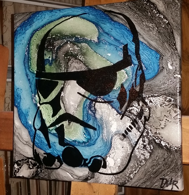 This was one of my first shots at hydro dipping. I hydro-dipped the canvas into a bucket of water, borax, and spray paint. Then I put a storm trooper on it. I did a similar one with Yoda, but I sold it. The storm trooper just doesn't wanna go anywhere.