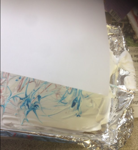 8 Than you take the ruler and you sweep all the foam of the paper, the food coloring stays on the paper.