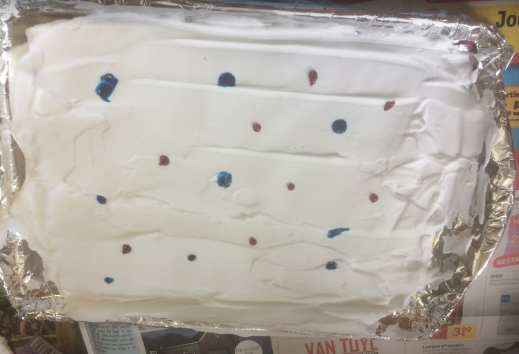 4 Take the foodcoloring and put some dots on random places. (I used the colors red and blue)