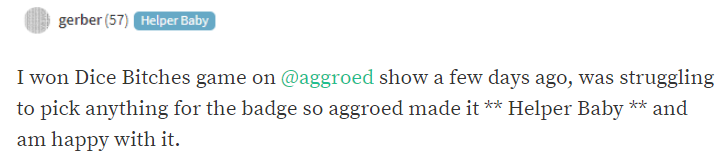 I won Dice Bitches game on @aggroed show a few days ago, was struggling to pick anything for the badge so aggroed made it ** Helper Baby ** and am happy with it.