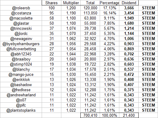 Right now, the program invests 10% extra on all the Steem that comes in each new level. This both speeds up the level progression and allows for each share to become a bit more expensive each round increasing the returns of existing shareholders (See Table). Each new Level that opens up, I would distribute an equal amount to that as curation reward dividends. (This makes it easy so there doesn't have to be a power down yet). A minimum number of shares needs to be owned before a shareholder can benefit from these curation rewards and there would be a multiplier for up to 100 Shares. Having 10 Shares or less would not give curation dividends. Everything above would have a multiplier of 0.2% for each extra share. (Formula = 1+ "Amount of shares" x 0.002). The reason for the multiplier is both because bigger upvotes potentially give better curation rewards along with the fact that it's a good way to give back to those who have supported the project and give a good incentive to get involved into this project which increases the returns for everyone.This is what curation reward dividends would look like when Level 18 is ready to open up...