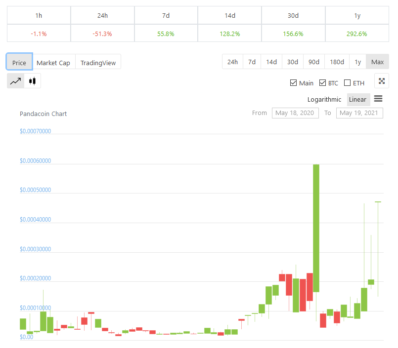 Pandacoin [PND] is a cryptocurrency with its own blockchain. The most actual price for one Pandacoin [PND] is $0.000379. Pandacoin is listed on 1 exchanges with a sum of 8 active markets. The 24h volume of [PND] is $196.98, while the Pandacoin market cap is $12 318 926 which ranks it as #1114 of all cryptocurrencies. You can find more information about Pandacoin [PND] on pandacoin.tech digitalpandacoin.org