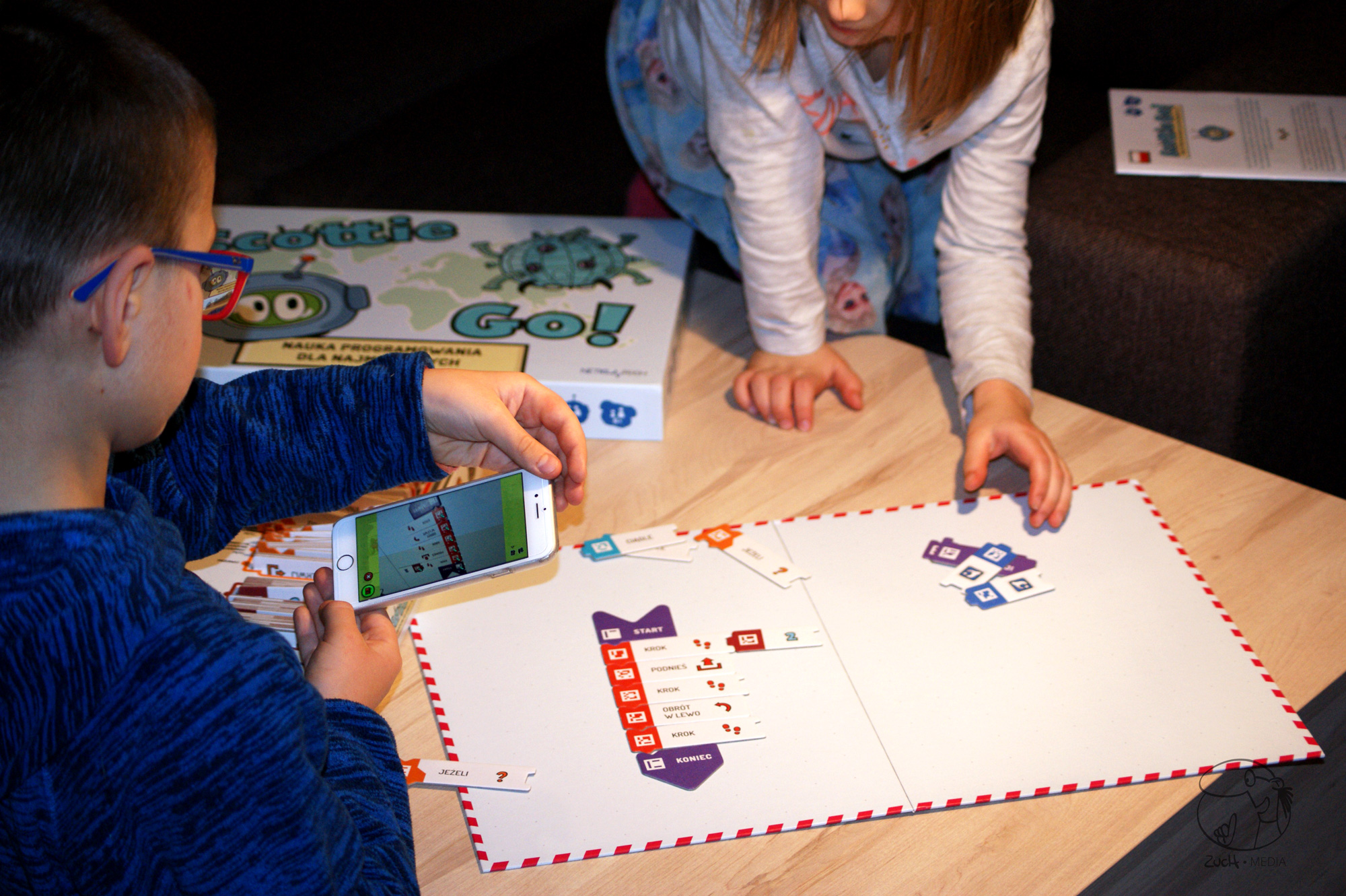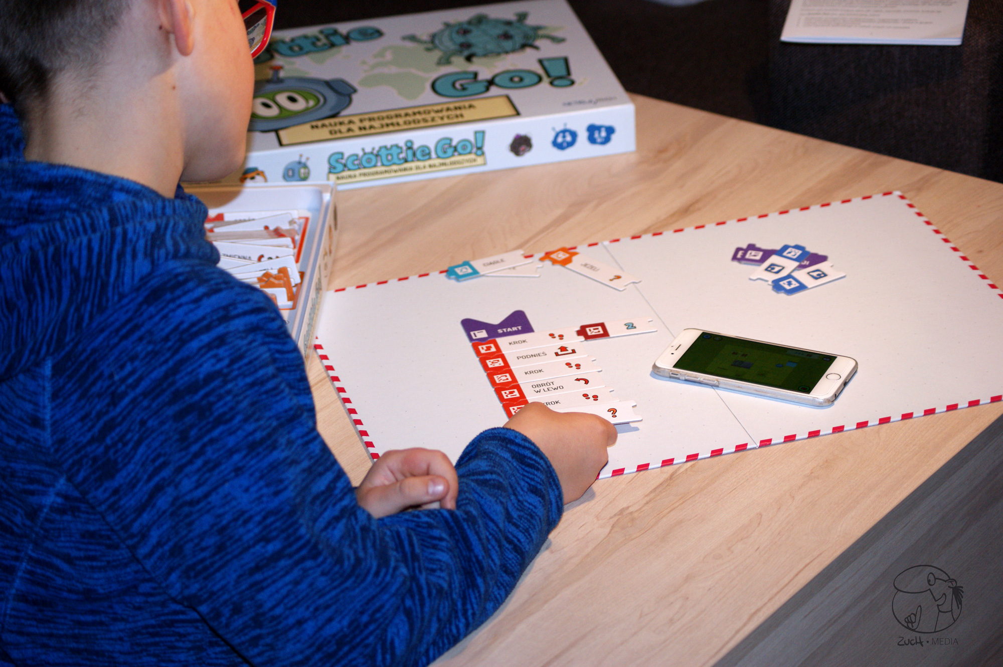 Scottie Go! Is a combination of cardboard puzzles pieces and an app for smartphones and tablets. That’s the way the scientists from the Poznań Supercomputing and Networking Center thought it out, and I have to honestly say, that they thought it out well. The entire learning process is entwined with a game and lots of fun. It really engages children, and they don’t even notice that they are learning. On the story level, the child has to help Scottie the robot, to repair his ship and go back home. On following levels, Scottie has to collect missing parts and avoid obstacles. But he can only do so if we show him a sequence of actions to perform. Here the key element of programming comes into play. Because you see, coding starts with logical thinking and creating an algorithm. Programming language and thousands of lines of code – that comes later. First the algorithm.