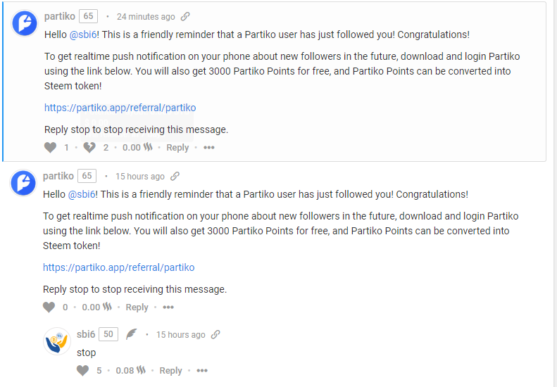 Partiko sends spam. Account replays with 'stop' to opt-out of receiving more spam. Fifteen hours later, partiko sends the same spam again.