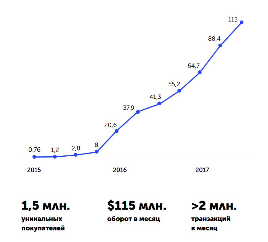 Выручка Best2Pay в месяц, погашение кредитов и peer-2-peer переводы за 2015-2017гг (USD)